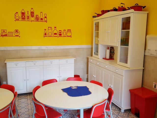 O refeitório possui comunicação direta com a cozinha por elevador, bancada para os alimentos, louças, talheres, mesas e cadeiras para cada idade.